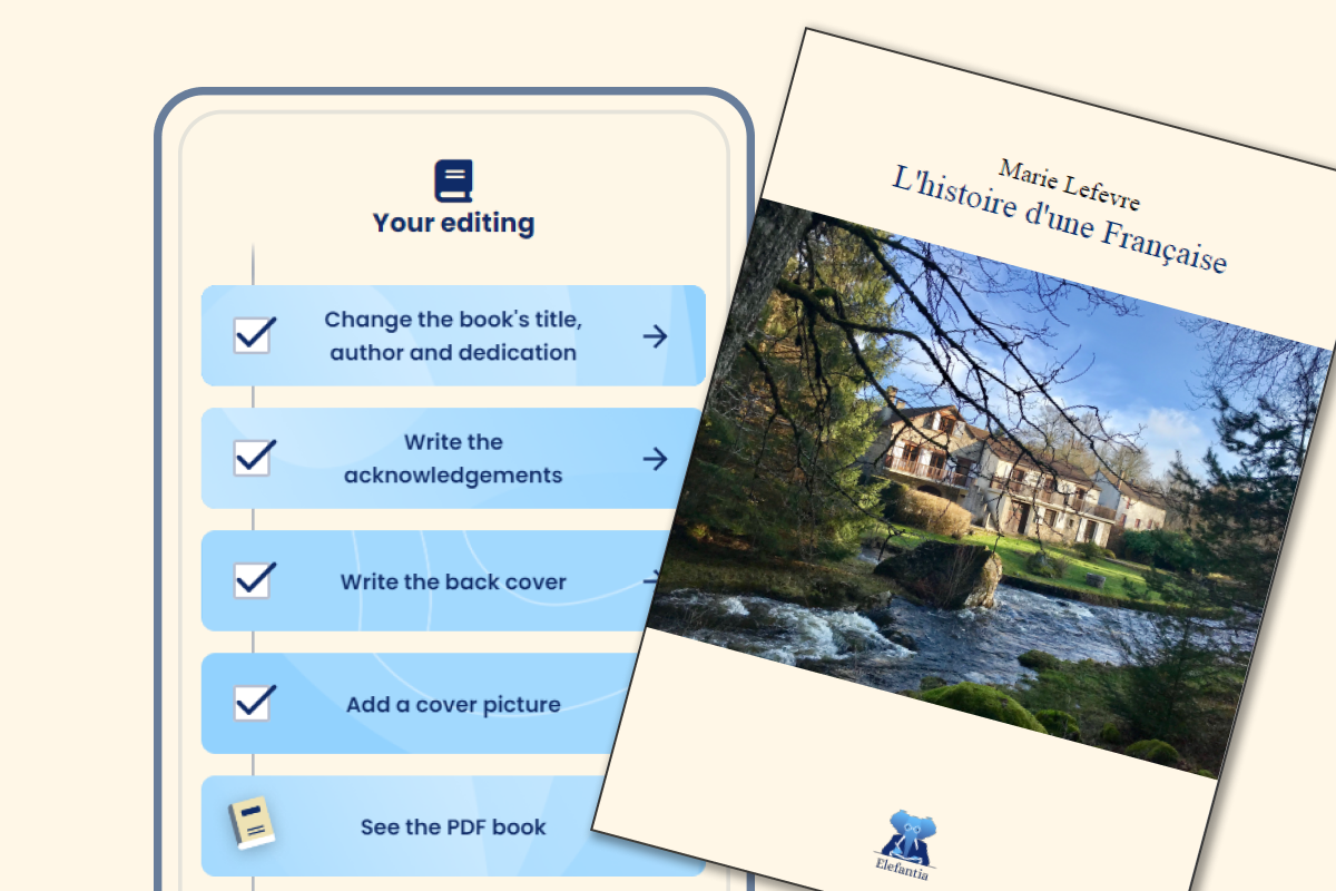 With Elefantia, you benefit from a one-month free trial to create the structure of your story, answer your first interview , generate the associated chapter, as well as all other features such as inserting photos, writing the back cover, creating the PDF manuscript, etc.
