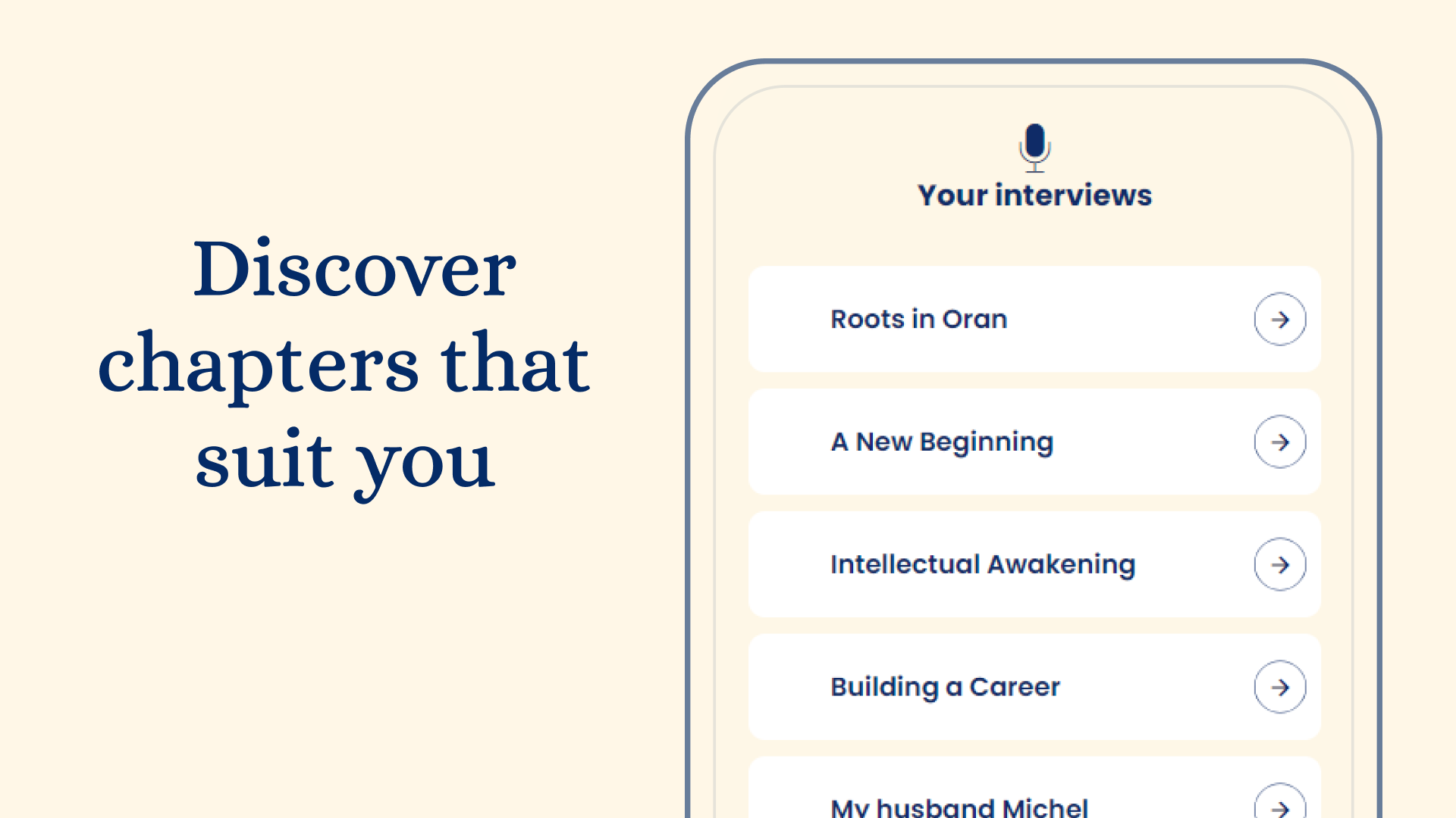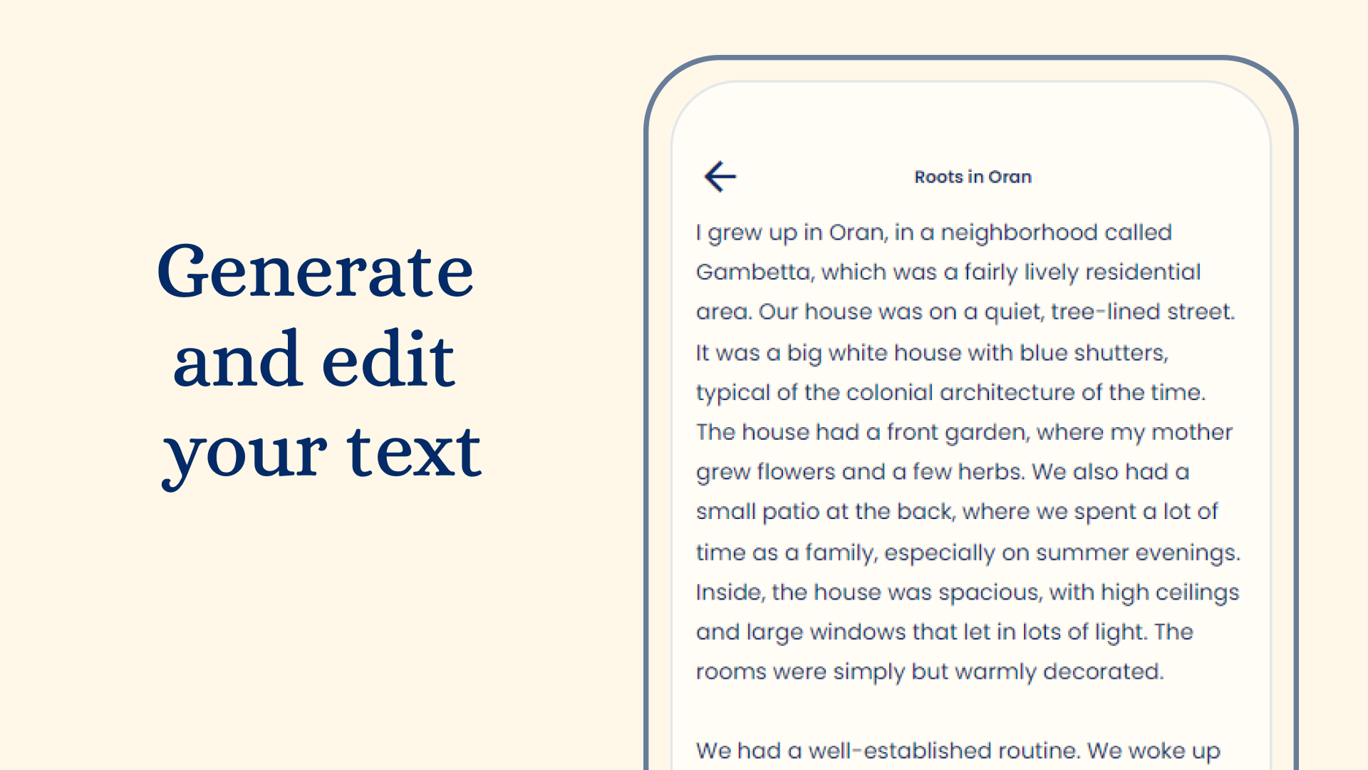 Our artificial intelligence generates the chapters of your life story based on your responses. These chapters are fully editable, giving you the ability to adapt and personalize your story to perfectly reflect your vision. You can review and edit each section to ensure accuracy and depth, adding your own voice and style.