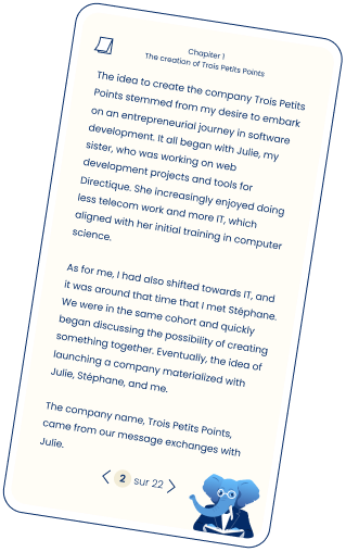 See detailsYou are accompanied for 4 to 20 hours by an Elefanto at your service who will guide you with Elefantia to create your life story.