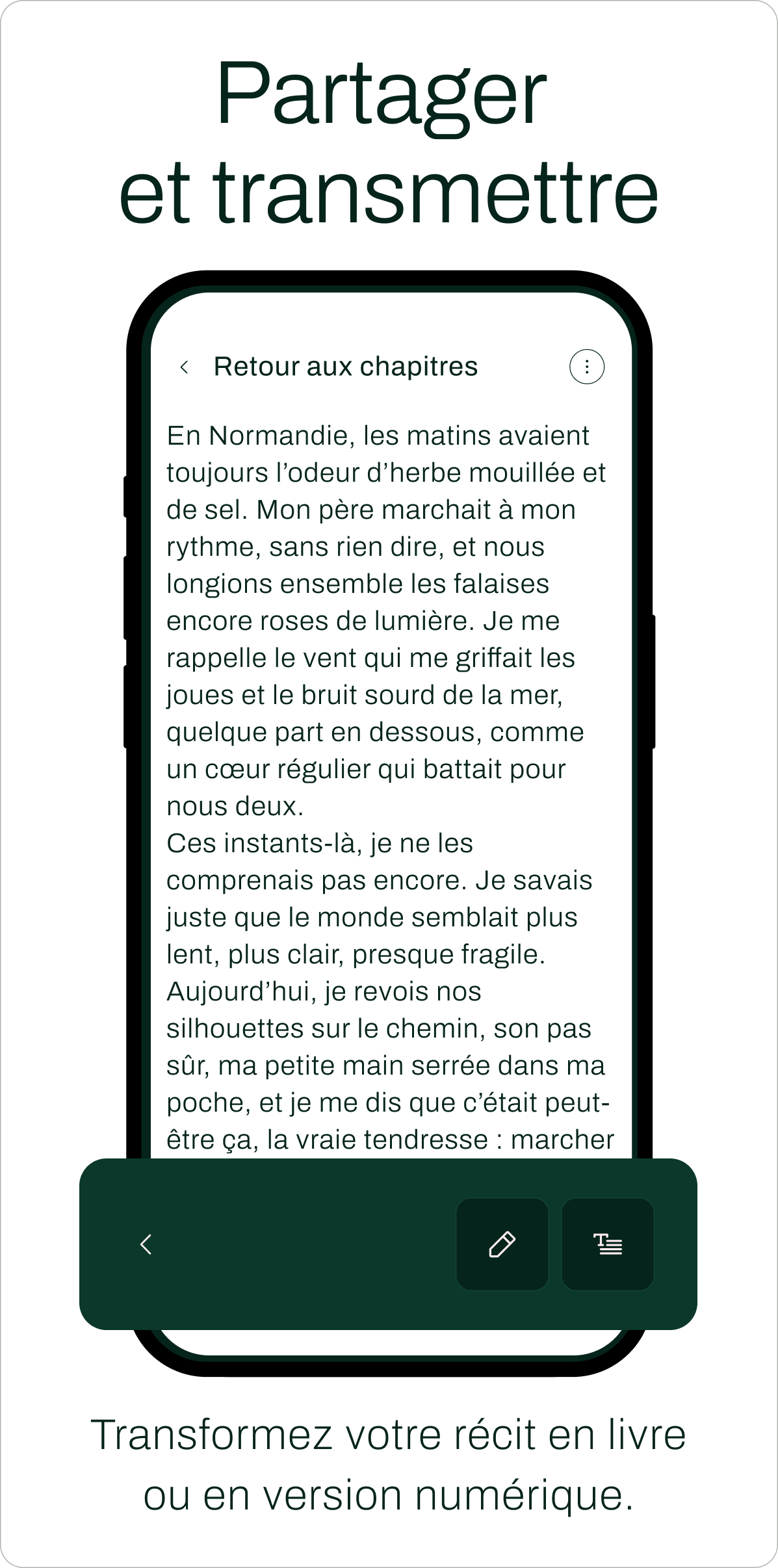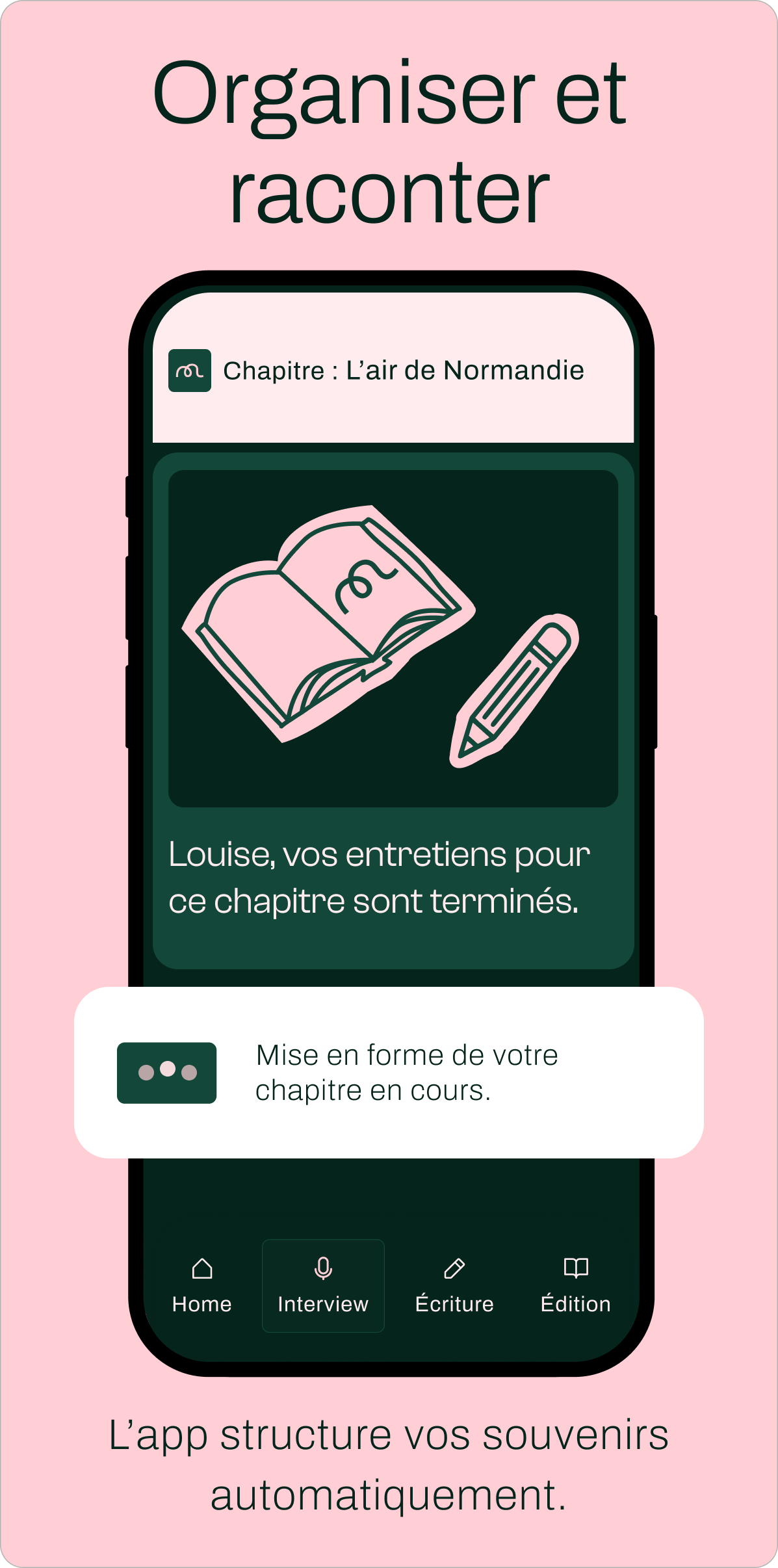 Vos souvenirs se transforment en chapitres clairs, structurés pour vous accompagner.